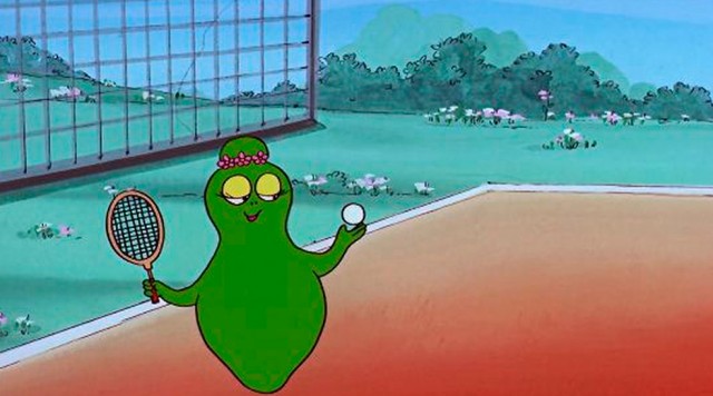 Barbarød viser Barbablå og Barbagrøn, at han er rigtig god til at spille tennis og til sport i det hele taget, men ikke til ridning.