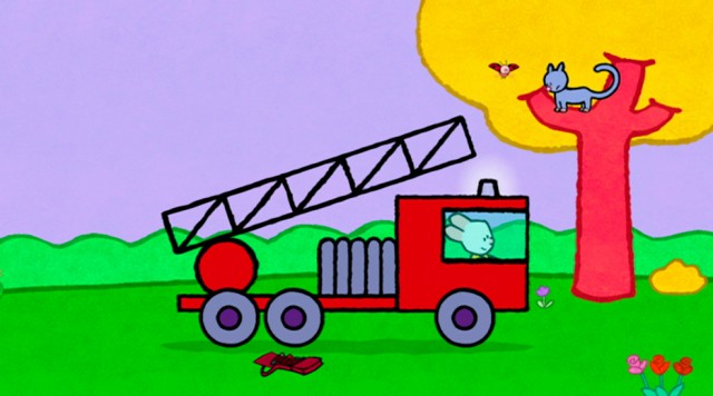 Louie finder en lille kat, der ikke kan komme ned fra et træ. Hvordan kan han hjælpe den med at komme ned? Louie og Yoko tegner en flot brandbil.