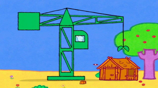 Louie og Yoko har bygget en skøn hule under æbletræet. Men æblerne falder hele tiden ned og trommer på taget. Sikke en larm! Hvad gør de? Louie tegner en kran.