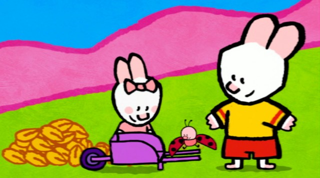 Louie samler blade sammen i haven. Sophie og Yoko flytter bladene. For at de ikke hele tiden skal gå frem og tilbage, tegner Louie en trillebør. Smart!