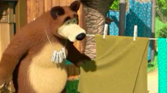 Bjørn hænger vasketøj op ude i sin have og har ingen anelse om, at han snart bliver nødt til at trække Masha op af en mudderpøl og ud af et syltetøjsglas.